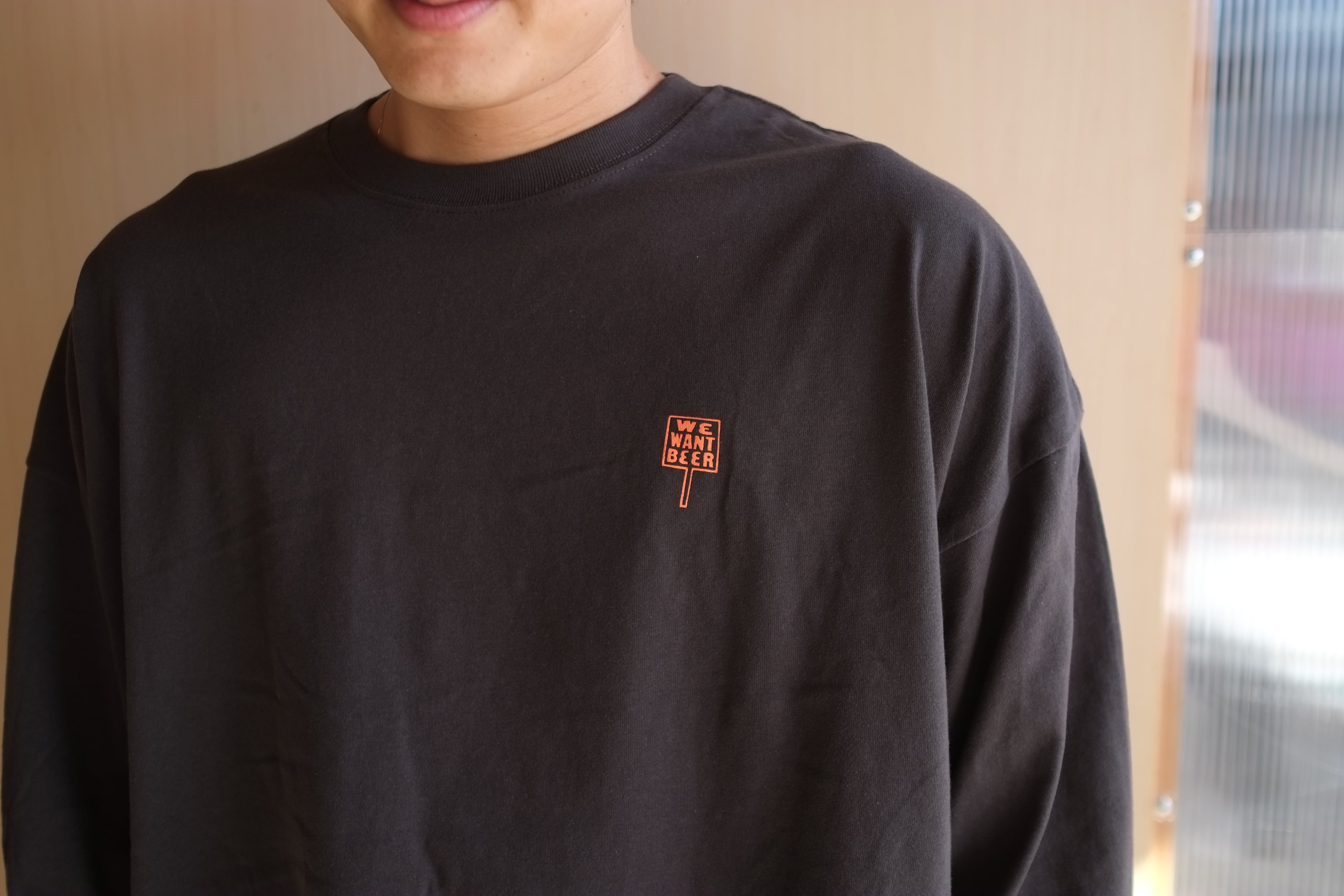 大人気のWE WANT BEERのロンTの新色インク色はホワイト×蛍光オレンジ。